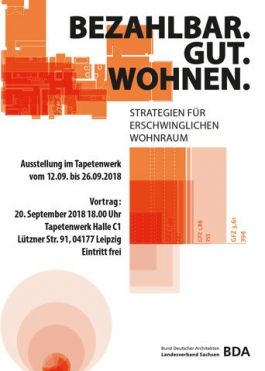 Die Ausstellung „Bezahlbar. Gut. Wohnen – Strategien für bezahlbaren Wohnraum widmet sich einem Grundbedürfnis der Menschen, welches durch stetig ansteigenden Mieten in den Ballungszentren immer weniger erschwinglich ist. Architektur und Städtebau können einen entscheidenden Beitrag leisten, neue Lösungsansätze zu finden. Die Ausstellung zeigt beispielhafte Bauten internationaler Architekturbüros, veranschaulicht Potentiale, Probleme und Abhängigkeiten verschiedener Ansätze. Die Ausstellung setzt nach der der Ausstellung „Neue Standards – 10 Thesen zum Wohnen“ und dem Januar- Symposium zu Baustandards den thematischen Schwerpunkt „erschwinglicher Wohnungsbau für alle“ des BDA Sachsen fort.